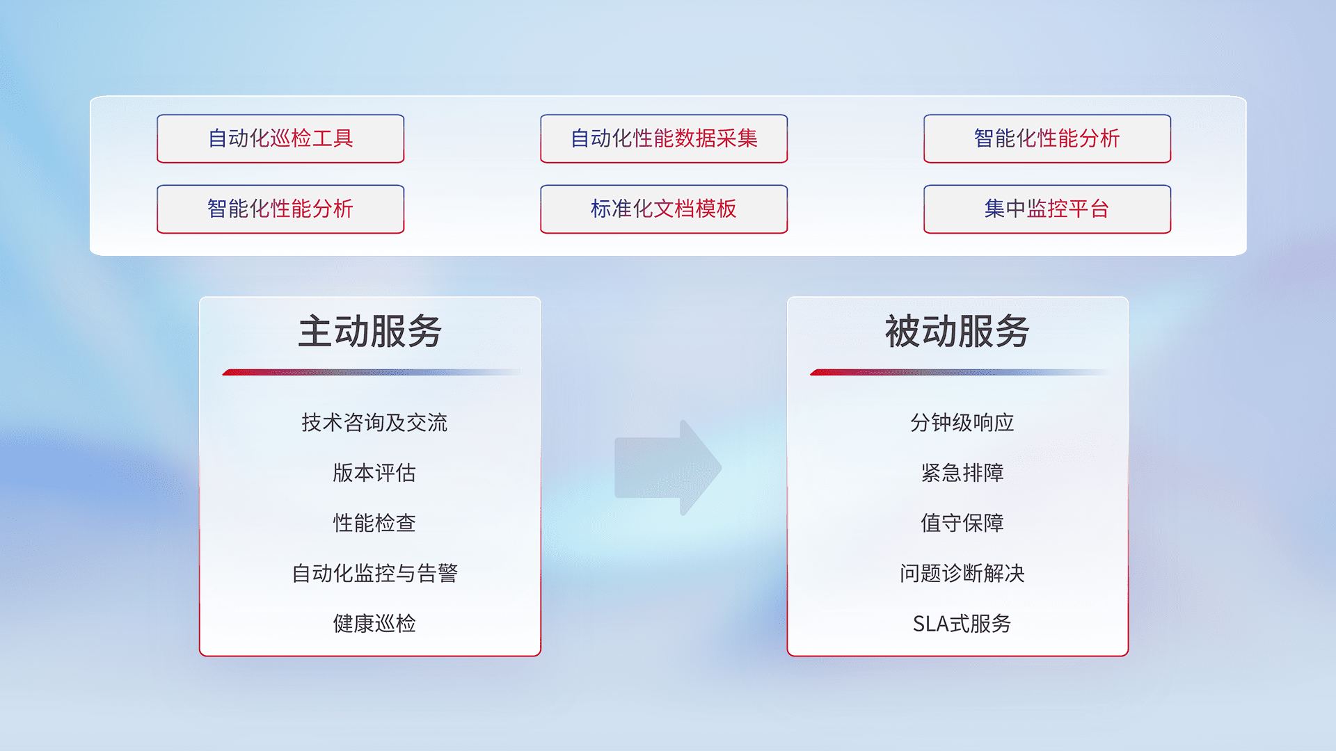 智能化工具和标准化文档,,,保障服务质量,,,提供主动服务(包含技术咨询、、、、版本评估、、性能检查、、自动化监控与告警、、、、健康巡检)和被动服务包含(分钟级响应、、、紧急排障、、、、值守保障、、、问题诊断解决、、、SLA服务)。。。。
