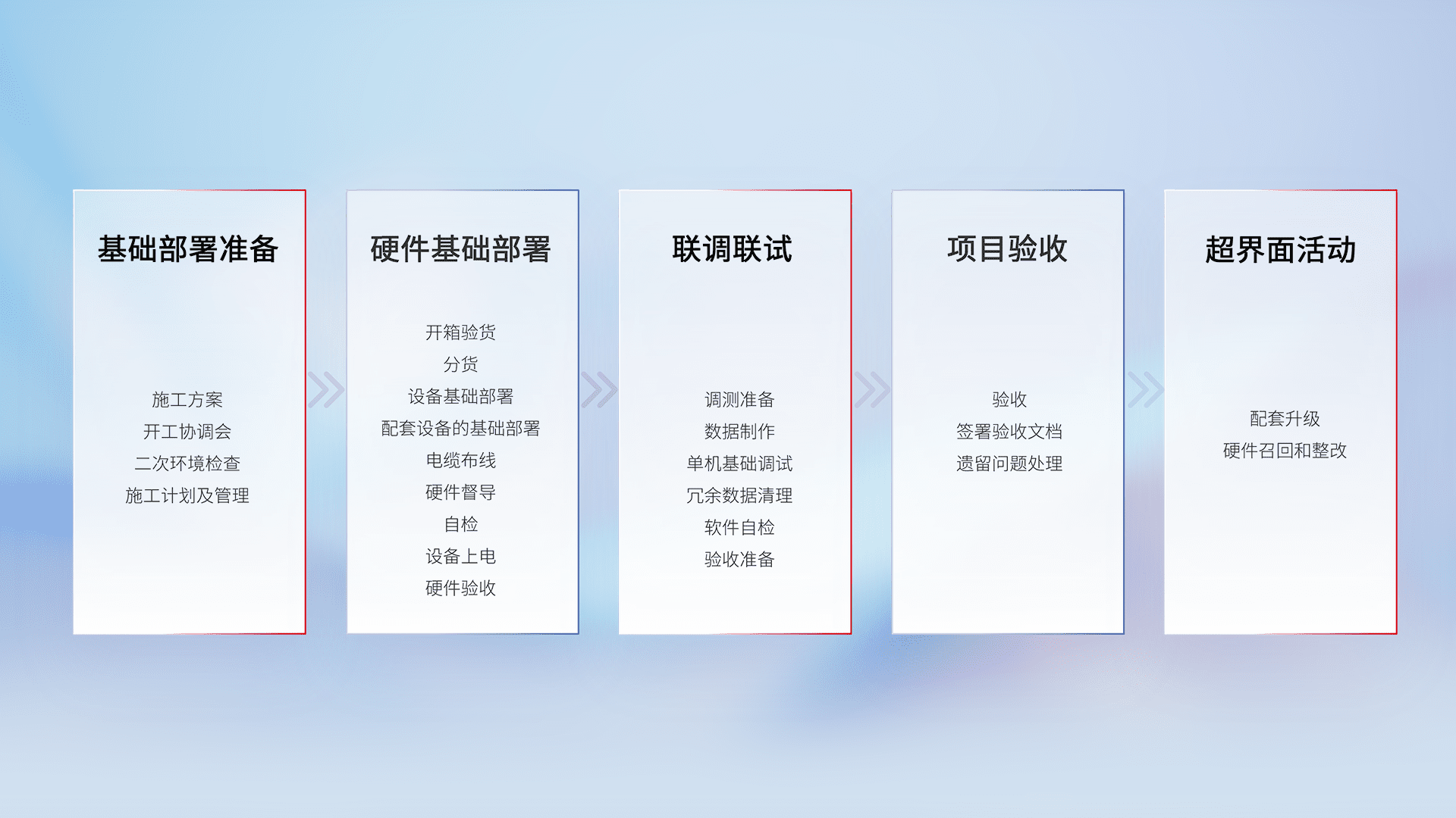 从基础部署准备、、硬件基础部署、、、、联调联试、、、、项目验收、、、越界面活动的全过程可追溯,,保证施工质量和进度。。