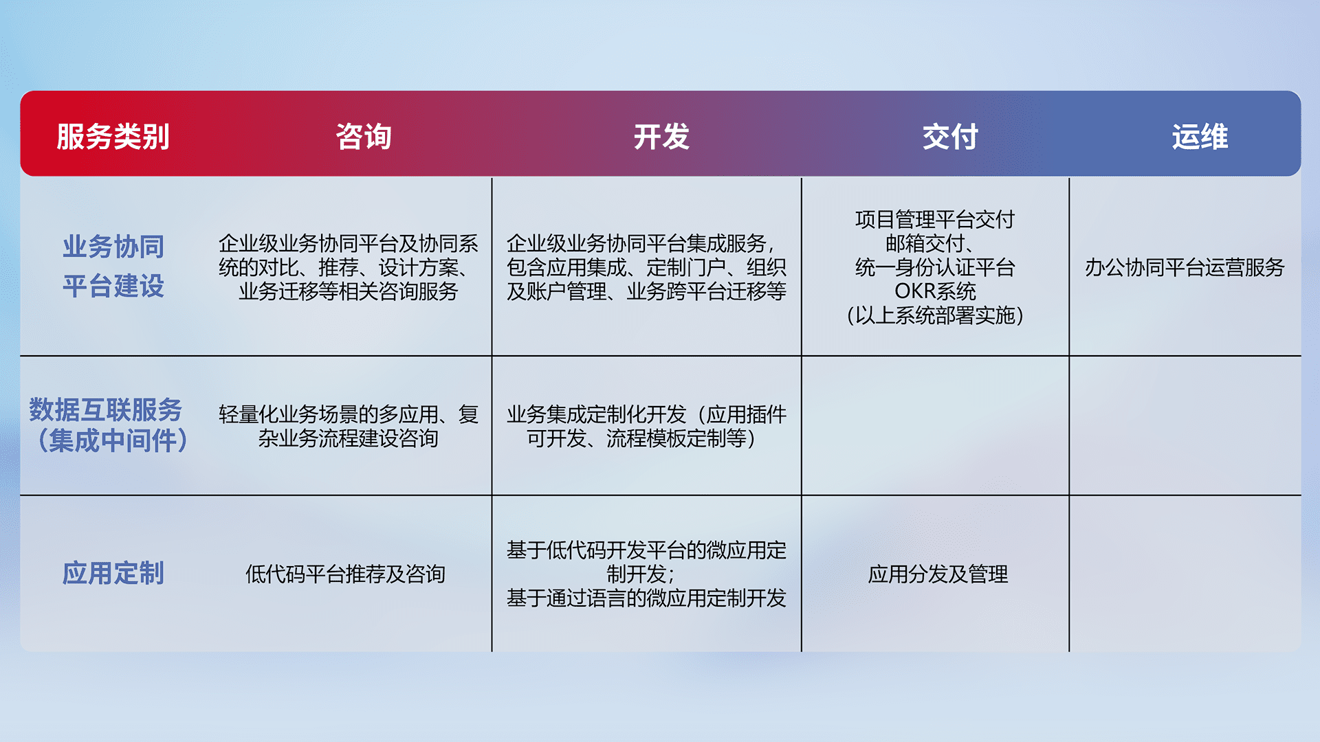 针对钉钉、、、、企微、、IDaas等平台级产品提供产品的规划、、方案、、、交付、、、定制化开发等服务,,,,实现如统一协同办公、、、、智能客户服务、、混合会议管理、、、智能数据查询、、、等业务场景,,,实现数字化转型。。。